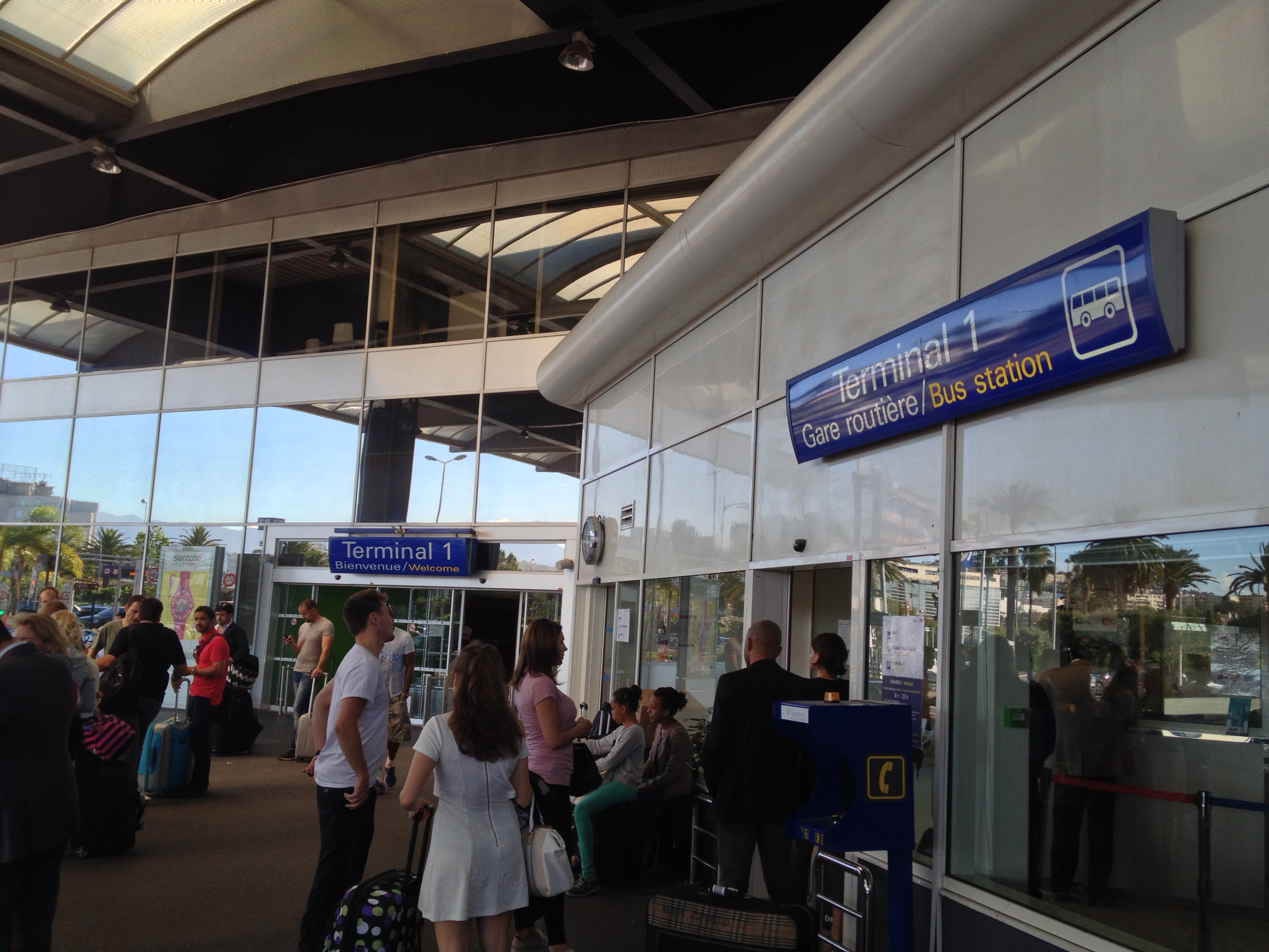 Many people have had questions about the bus from NCE (Nice) airport to Hyatt. From what I read online, some said this was easy and others said the bus didn’t stop by the Hyatt. So after I read One Mile At A Time’s 50Euro cab ride for 3 miles from the airport to Hyatt, I would figure out the bus route once we arrived. The staff working the tourist booth and bus stop were helpful. I looked over the map and determined that Bus 99 is what we needed to take. Once you walk out of Terminal 1 (the door on the left), you proceed to the door on the right in this picture: