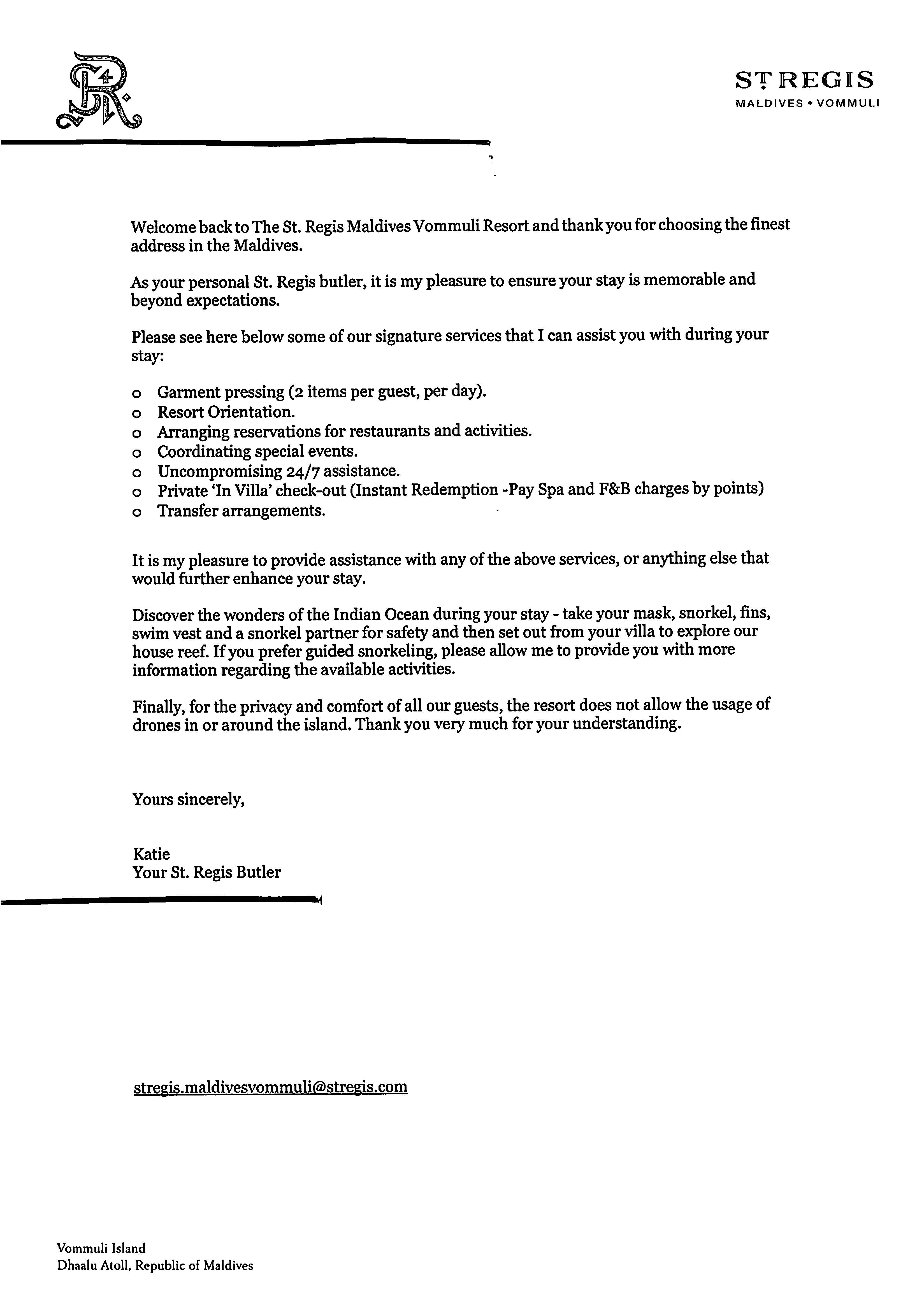The butler is available for 24/7 assistance. See the welcome letter here.